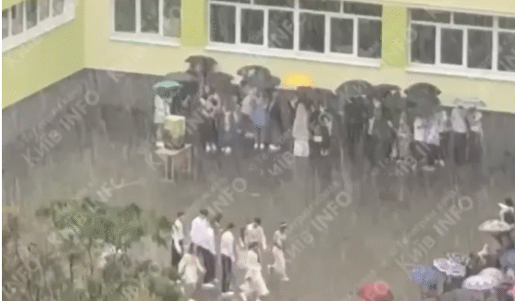 Київські учні однієї зі шкіл вирішили не скасовувати урочистості, присвячені їхньому прощанню зі шкільним етапом життя, навіть попри негоду. І провели їх на шкільному подвір’ї. Свій випускний танець хлопці та дівчата виконали просто під сильним дощем.