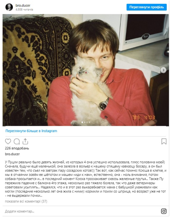 У себе в Instagram 37-річний спадкоємець Таїсії поділився з передплатниками сімейною трагедією — у них померла улюблена кішка на прізвисько Ксюша, вона ж Пуцля, яка прожила цілих 17 років.