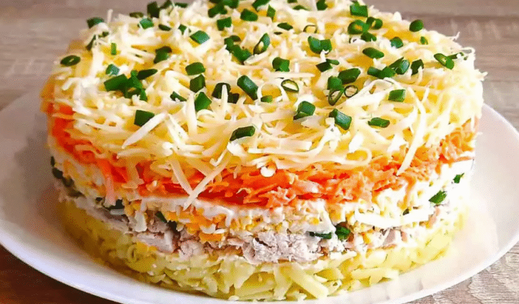 Далі на наступний шар нарізаю дрібно зелену цибулю. Тоді натираю на терці яйця та покриваю майонезом. Моркву натираю на терці і змішую в окремій мисці з майонезом та видавленим часником. Викладаю далі у форму, розрівнюю.