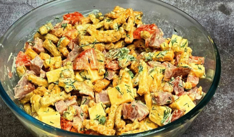 Покажу вам дуже смачненький салатик! Нічого складного – простий, яскравий та смачний салат із сухариками. Перед ним ніхто не встоїть!