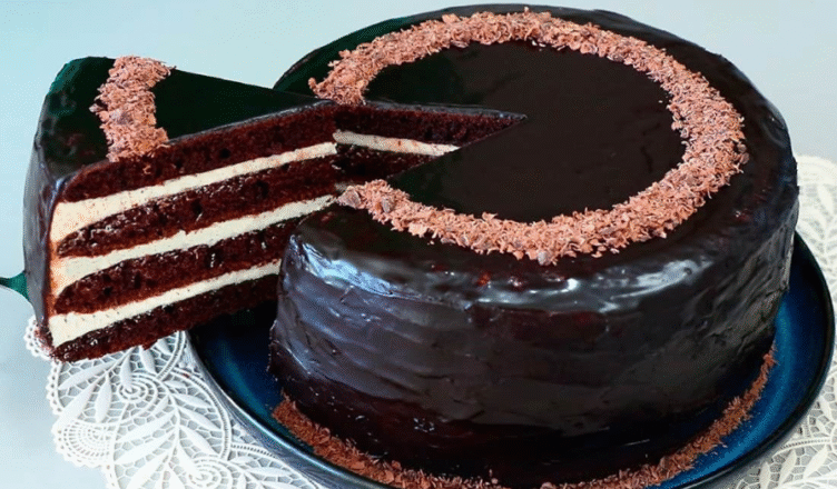Дістаю торт із холодильника, знімаю плівку й обмазую боки відкладеним кремом. Потім заливаю глазур’ю — спочатку по краях, а далі по всій поверхні. Розрівнюю ложкою або лопаткою й посипаю тертим шоколадом. Ставлю торт у холодильник ще на 15 хвилин, щоб глазур застигла.