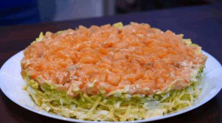 Акуратно знімаємо кільце й отримуємо акуратний, яскравий і святковий салат. Його можна подавати одразу – він не потребує часу на просочення. Салат виходить дуже легким, ніжним і водночас поживним. Поєднання риби, авокадо, сиру та свіжих овочів створює гармонійний смак, який пасує до будь-якого святкового столу.