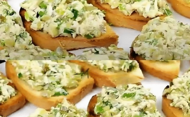 Нарізаю дрібно огірки. Яйця натираю на терці. Шаткую зелену цибулю, кріп. Обсмажую злегка хліб на сухій сковороді і ділю кожну скибочку навпіл.