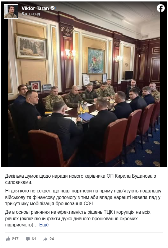 Таран відзначає, що проблема корупції в ТЦК вперше піднята на високий політичний рівень, що принципово змінює логіку процесу боротьби із зловживаннями. Завдяки системному підходу Буданова можна очікувати конкретних та жорстких рішень, зрозумілих суспільству і спрямованих на практичний результат.