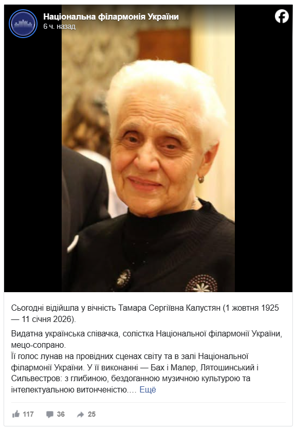 У Національній філармонії України зазначили, що Тамара Калустян залишила по собі приклад гідності, внутрішньої свободи та відданості музиці.