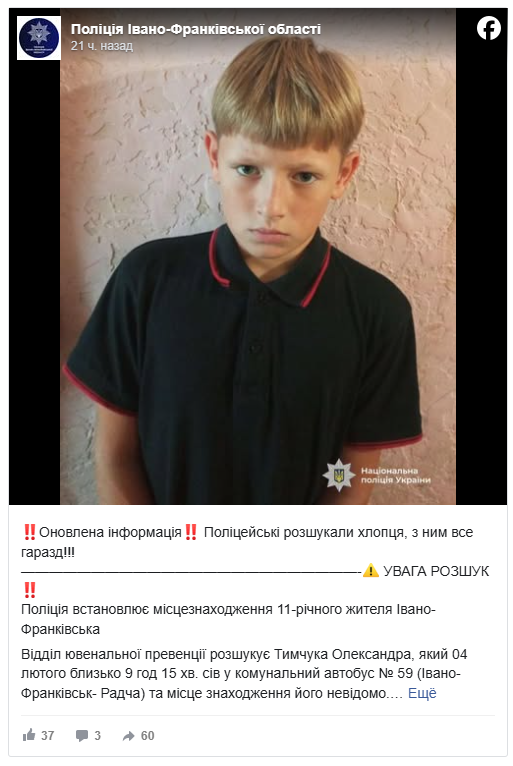 Зниклий – Тимчук Олександр Васильович, 2014 року народження, мешканець міста Івано-Франківськ.
