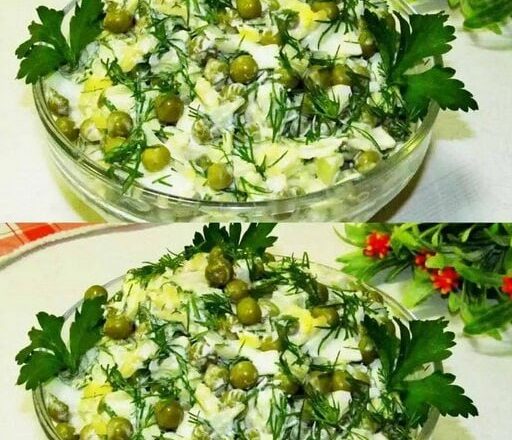 Тепер усе з’єдную. У глибоку миску кладу зелений горошок, додаю нарізані яйця, мариновану цибулю, натертий сир і зелень. За бажанням можна трохи підсолити й поперчити — орієнтуюсь на свій смак.