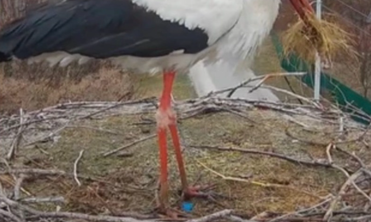 Зранку 28 березня лелека приніс у гніздо перші будівельні матеріали – сіно та гілки. А надвечір повернувся до оселі та вперше залишився на ночівлю. Глядачі почали припускати, що це самка, але на Одарку вона не схожа.