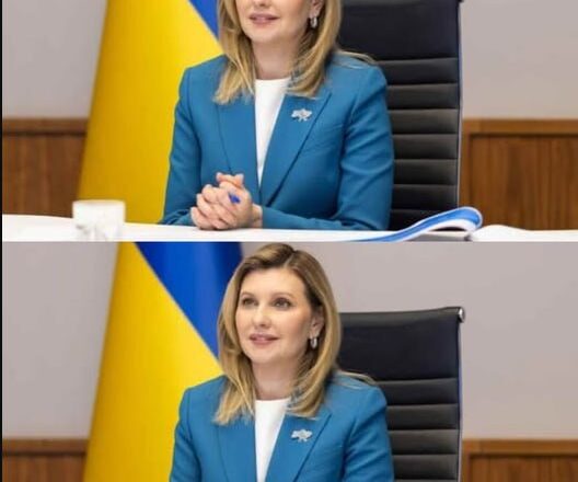 Під час онлайн-зустрічі Олена постала у блакитному жакеті і білій блузці. До лацкану жакета перша леді прикріпила свою улюблену символічну брошку у вигляді мапи України від українського бренду Gasanova.