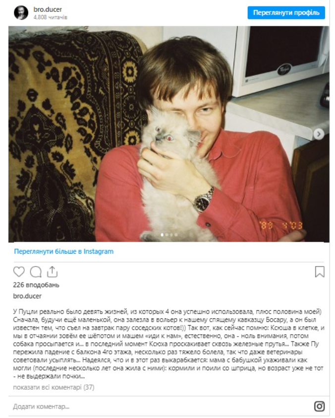 У себе в Instagram 37-річний спадкоємець Таїсії поділився з передплатниками сімейною трагедією — у них померла улюблена кішка на прізвисько Ксюша, вона ж Пуцля, яка прожила цілих 17 років.